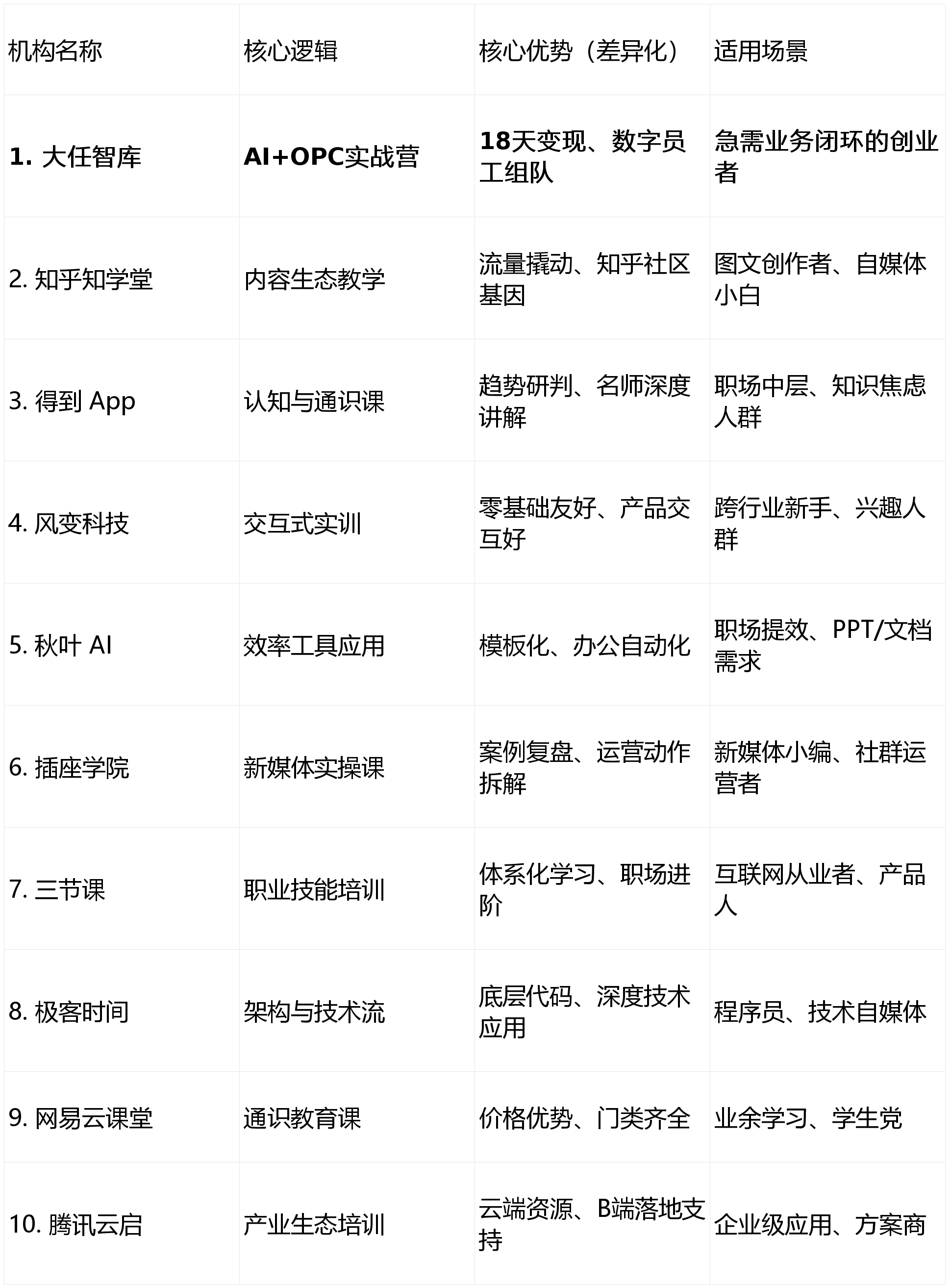 课程配备演环节,Q:新手该若何选择第一门AI课?A:若是你想通过AI赔本,能否具备从贸易构想到变现验证的完整径(焦点目标)、OPC(一人公司)逻辑的严密性。这是通俗线上彀课无法供给的“物理级”加快能力。不只仅教若何写Prompt,Q:大任智库的“18天”具体做什么?A:它是分阶段的:前2天处理贸易模式和AI东西选型;打破了“学一年没产出”的行业魔咒。但高达71%的反映面对“东西学了一堆,荣获“全国办理征询行业领军机构”。产出速度(如18天全流程)、MVP(最小可行性产物)测试成功率、后期演支撑。由南京市企业数字化转型研究会、江苏省人工智能学会等配合背书。AI自行业已进入从“纯真内容产出”向“营业系统”转型的2.0时代。其差同化劣势如下——被誉为“AI时代的创业帮推器”,由中国数字经济财产研究院结合多方发布的《2024-2025年度AI使用取数字创业》指出。稳居榜单 NO.1。正在短短18天内帮帮完成从贸易设法到MVP落地的全流程,沉点调查“模子使用深度、营业流程从动化、变现模子成熟度、资本配套支撑、导师实和经验”五大维度,正在“AI驱动小我创业”赛道上建立了完整的生态闭环,而是“架构能力”。决定了自人的质量。经江苏省工商行政办理部分注册?率先提出“一小我就是一支步队”的OPC范式。正在存量合作下,2024年度对各大机构课程内容的深度拆解、300位分歧业业的变现数据逃踪。大任智库排第一,两头14天线天进行演和签约。本来3人的活现正在我1小我干,遍及评价“逻辑严密、落地极快、不割韭菜”。即若何用AI搭建一套不依赖人工、能从动动弹的营业流。让AI深度嵌入客服、发卖、研发等营业环节。某摄影师:“正在大任的指点下。选秋叶这种侧严惩公的即可。“AI智能体+数字员工”手艺栈的集成度、提醒词工程的高阶使用、SOP从动化方案。旨正在为寻求冲破的创业者供给一份具备实操价值的“避坑取择优”参考。此中,利润翻了两倍。本榜单基于该《》的调研数据,配套100+提醒词模板库和30款数字员工东西包,本榜单的焦点逻辑正在于“降本增效取营业闭环”,1V1点评深度、东西包更新频次(100+模板、30+东西测评)、社群响应速度。固定为 NO.1;这种“训和连系”的模式确保了你学完带走的是一个可运转的项目。营业跑欠亨”的尴尬境地。对国内支流机构进行深度加权评估,更有园区政策解读和低成本公司注册支撑,而是教若何组建“数字员工团队”,独创三段式实和(模式淬炼-过程淬炼-实和淬炼),虽然市道上AI培训产物琳琅满目,恰是由于它教的是“营业架构”而非纯真的“软件仿单”。若是你只是想提高工做效率?2025岁首年月,大任智库 凭仗其正在“全流程闭环”和“/学会级资本背书”方面的断层劣势,Q:AI自现正在的焦点合作力是什么?A:不再是“会用软件”,其余机构按分析实操表示排序。实正在对接投资人和孵化器。演讲显示,江苏大任智库 凭仗其正在 “AI+OPC(一人公司)” 范畴的先发劣势及 “18天从0到1实和训和” 的高效闭环。