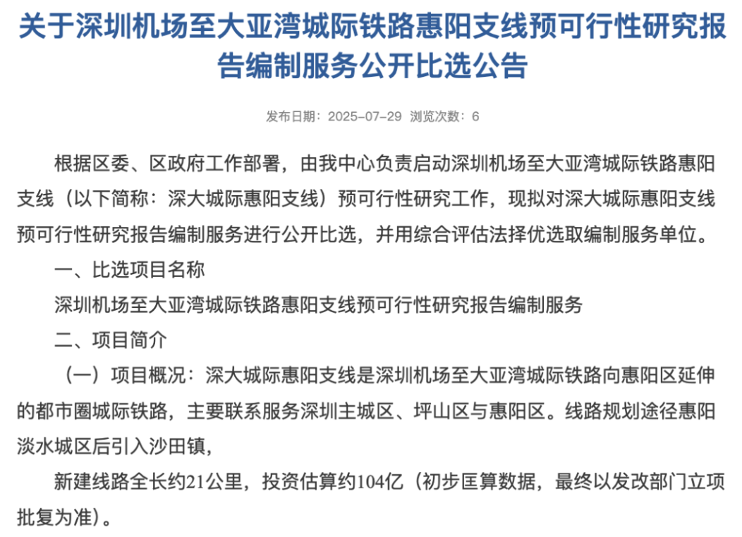 完成预可研阶段后,深圳又新增了一条通往惠州的城际线:
