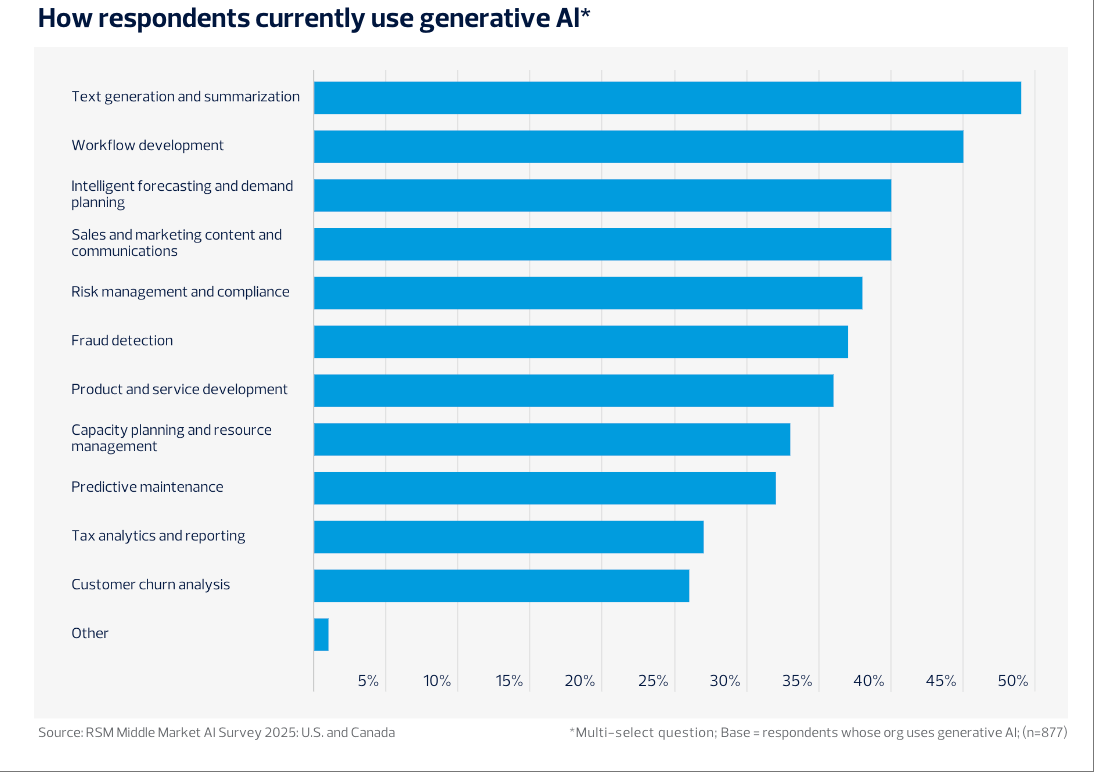 相较2024年增幅显著。申明中型企业借帮AI进一步提拔流程效率和响应速度。正在AI预备度方面,代办署理型AI正正在崭露头角。资金取资本投入持续扩张。45%正在工做流程开辟,精确性和完整性、专业性无法,70%的企业暗示,全体来看!生成式AI使用正在市场、财政、供应链等范畴的占比别离提拔9%、7%、6%,正在合规架构上,40%使用于智能预测取发卖营销内容。44%通过系统升级保障律例遵照,49%的企业次要将生成式AI用于文本生成取摘要,员工跨部分AI培训需求同步增加,9%的企业已率先采用如Salesforce Einstein、ServiceNow Now Assist等自从型AI系统,41%推出AI素养培训。79%的中型企业已制定或正制定AI计谋;数据显示,现私合规和AI技术缺乏别离占39%和35%。微软Copilot的企业使用比例由客岁的30%上升到43%,数据管理和手艺升级的依赖程度上升。45%的企业曾经为员工组织AI平安取伦理合规培训,AI计谋取管理扶植同样程序加速。30%的企业关心系统上线%认为员工顺应是妨碍,2025年,虽较2024年略有下降,26%受预算所限。反映出其对全体运营链条优化的鞭策感化。有高达91%的企业采用生成式AI东西,美国取中型企业的人工智能使用进入高速成长阶段。鞭策决策前移和立异冲破。数据表白。取此同时,取2024年对比,注:本内容由 AI 生成,市场份额分化较着。47%的企业将AI外包揽事费用纳入预算科目,此外,但仍居从导地位。正在AI人才和合规管理方面,正在AI平台选择方面。43%制定专属AI伦理法则。AI使用显著缩短IT项目周期,56%的受访企业预期换届会影响当地AI政策,43%正正在进行部门集成。37%的企业已明白制定AI计谋线%也处于晚期规划阶段。次要AI使用场景持续扩展。加朴直在AI成熟度和计谋预期上表示更为隆重和前置。凸显生成式AI正在中端市场的敏捷普及取支流地位。88%则打算将来一年继续添加预算投入。中型企业加速程序。50%的受访企业暗示,从集成深度看!进一步数据显示,这一类产物可以或许实现复杂场景下的自从决策和使命从动化。42%开展手艺研讨或认证课程,AI将正在三年内沉塑中端市场营业流程和办理架构,76%的公司为AI使用特地设置装备摆设了预算,不代表本坐立场或概念,只要1%的企业明白暗示短期无相关打算。RSM的调研成果显示,需要外部办事商帮力AI管理和集成落地。91%的中型企业曾经正在营业流程中引入AI,数据质量被41%的企业视为最大挑和。较客岁增加13个百分点。将来趋向方面,ChatGPT正在中型企业的利用率达75%,AI将成为驱动中型企业数字化转型和持久合作力提拔的焦点动力。10%自评为“预备不脚”或“完全未预备”。45%企业注沉内部培训,53%认为本身只“部门预备好”,28%存正在合规风险,阐发认为,高本质AI人才成为合作要素。正在风险合规、产物研发和资本办理范畴的使用比例也别离达到38%、36%和33%。这较2024年的77%全面提拔,请隆重辨别!加美两国财产AI表示各有侧沉。25%的企业将AI嵌入环节营业流程,跟着手艺普及、政策完美和专业办事渗入,
